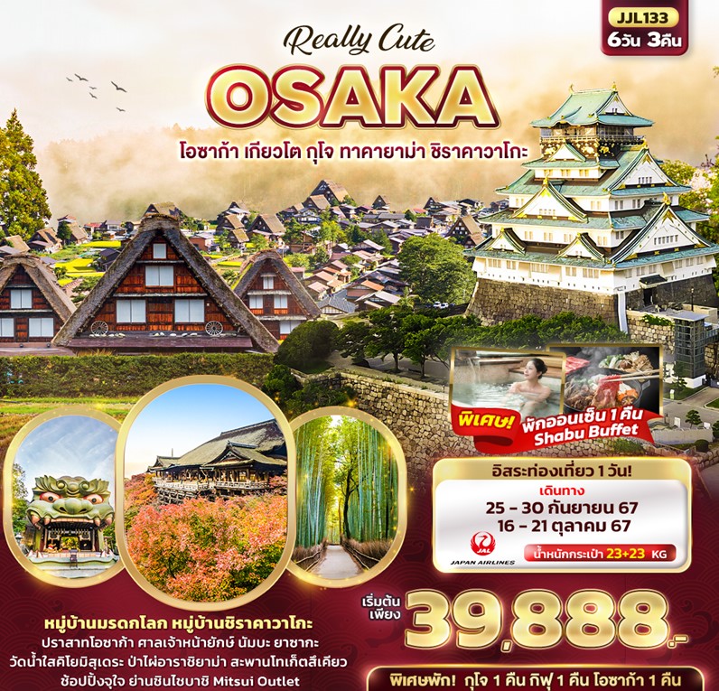 | วันที่ 2 | ท่าอากาศยานนานาชาติสุวรรณภูมิ - ท่าอากาศยานนานาชาติคันไซ JL728 BKK-KIX 00.25-08.00 – โอซาก้า – ศาลเจ้านัมบะยาซากะ – ปราสาทโอซาก้า (ไม่รวมค่าเข้าชม) – Mitsui Outlet Park Shiga Ryuo – กิฟุ - อาบน้ำแร่แช่ออนเซ็น |