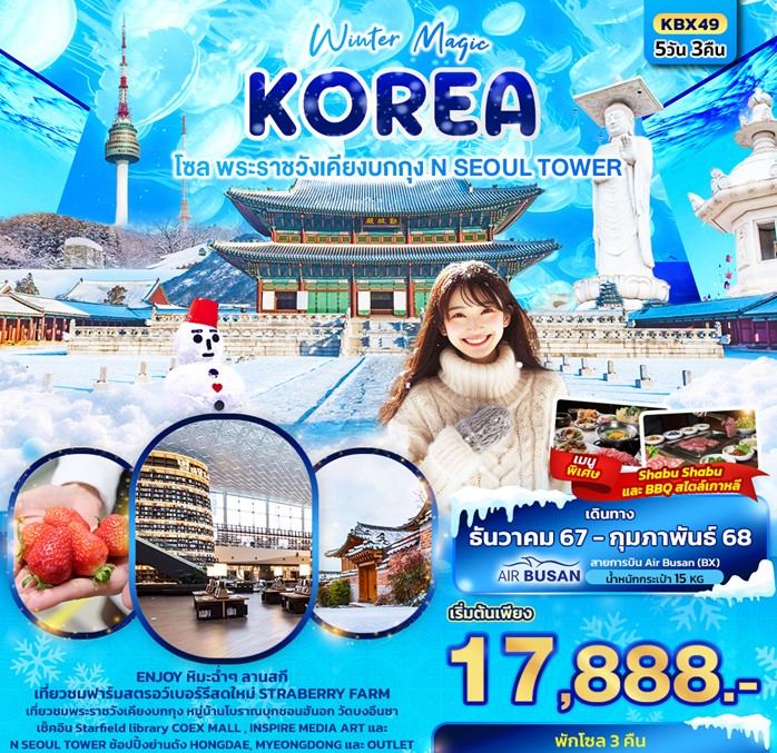17.15 น. เดินทางกลับ ประเทศไทย โดยสายการบิน AIR BUSAN (BX) เที่ยวบินที่ BX747