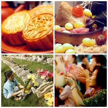 •    เชงเม้ง : ประเพณีที่สำคัญมากที่สุดของของชาวจีน คือ ไหว้บรรพบุรุษที่สุสาน (ฮวงซุ้ย) เป็นการแสดงความกตัญญูต่อบรรพบุรุษ โดยมีอิทธิพลมาจากลัทธิขงจื๊อ ที่เน้นเรื่องความกตัญญูเป็นสำคัญ