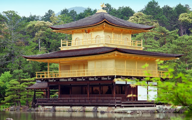 มีชื่ออย่างเป็นทางการว่า วัดโระคุอง「鹿苑寺」มีศาลาทองเป็นจุดเด่นของวัด โดยภายนอกของศาลาถูกตกแต่งด้วยทองคำบริสุทธิ์เหลืองอร่ามทั้งตัวศาลายกเว้นชั้นล่าง ศาลาใช้เป็นที่ประดิษฐานของพระธาตุของพระพุทธเจ้า ในด้านสถาปัตยกรรมของศาลาทองแห่งนี้มีความโดดเด่นมาก เพราะประกอบไปด้วยสถาปัตยกรรม 3 แบบที่ไม่ซ้ำกันทำให้เห็นถึงการเปลี่ยนของศิลปะในแต่ละยุคได้เป็นอย่างดี