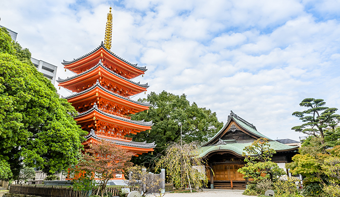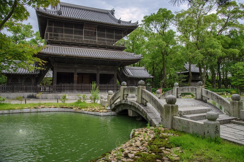 วัดหลักของศาสนาพุทธนิกายชินกอนของภูมิภาคคิวชู มีอีกชื่อว่า นันกากุซัน ตามประวัติเป็นวัดเก่าที่ถูกสร้างตั้งแต่ ค.ศ.806 โดยพระชื่อดัง Kobo-Daishi สมัย Heian ซึ่งถือเป็นวัดที่เก่าแก่ที่สุดแห่งหนึ่งในญี่ปุ่นและได้รับการดูแลให้เป็นแหล่งประวัติศาสตร์ของเมืองฟุกุโอกะ ภายในวัดมีวิหารซึ่งเป็นที่ประดิษฐานของพระพุทธรูปนั่งทำจากไม้แกะสลักที่ว่ากันว่าเป็นพระพุทธรูปนั่งที่ทำจากไม้ที่สุดที่สุดในญี่ปุ่นโดยใช้เวลาสร้างนานถึง 4 ปี โดยเป็นที่รู้จักกันในนาม Fukuoka Daibutsu หรือพระใหญ่แห่งฟุกุโอกะ